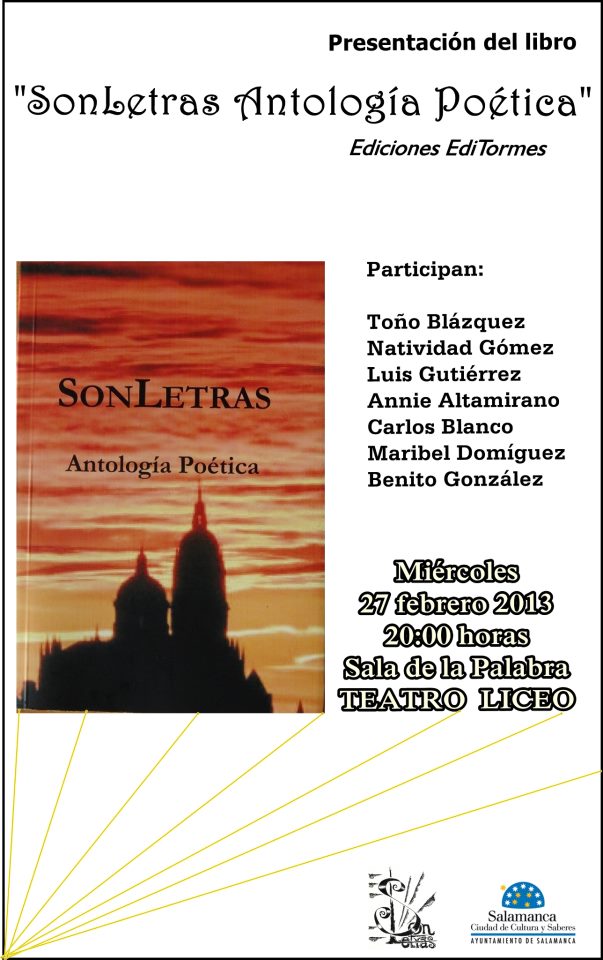 Anoche, con gran emoción y rodeados de familia y amigos, SonLetras presentamos nuestra Antología Poética en la Sala de la Palabra del teatro Liceo de Salamanca. Estas fueron las palabras con las que abrí la presentación luego que Pilar Fernández Labrador, con muchísimo cariño, nos diera la bienvenida y la enhorabuena.